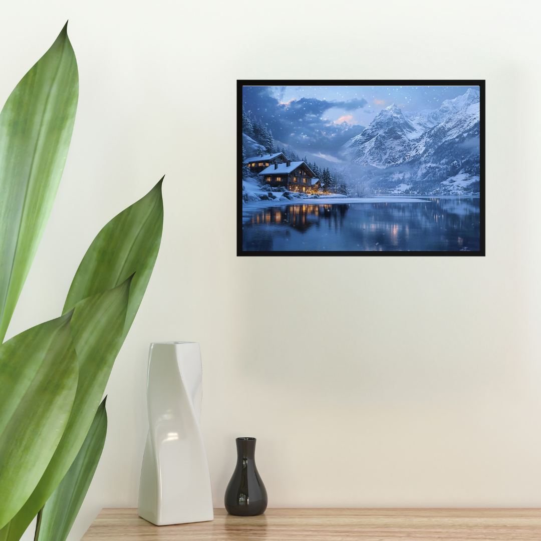 Winter in the Swiss Alps: Snow-covered mountains, frozen lake, and cozy chalets - Landscape